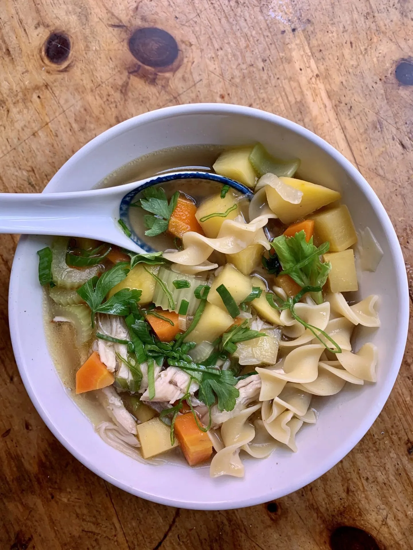 Top your noodles with your hot soup, whatever herbs you have leftover, and more cheese (if you want). Some hot sauce? You do you! Eat with whatever spoon sparks the most joy. For me, it’s a dumpling spoon. But if you don’t have one, riff it.