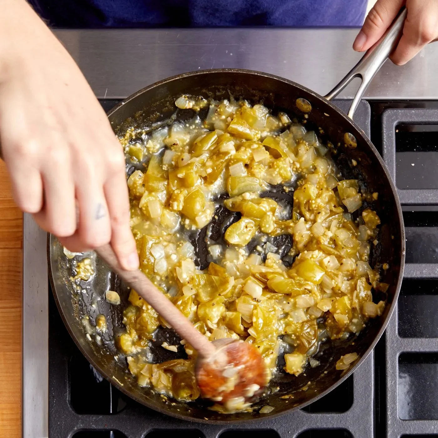 For an easy salsa, start with chopped (or blended) tomatillos. Add them to a pan with sautéed garlic and onion. If you like, a slightly hot pepper, like a poblano, helps balance out the pleasant tartness.