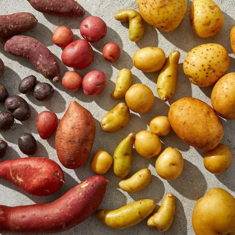 These tri-colored, tiny potatoes are both delicious and adorable. They have thin skins and a waxy interior. They’re well-suited for roasting or boiling, but their waxy flesh isn’t ideal for mashing. The thin skin doesn’t need to be peeled if you’re roasting or boiling, which makes preparation easy. We love using these tiny potatoes to make incredible salads. Simply boil them, toss with a tarragon and cornichon dressing, and eat warm with a dinner like our Chicken Paillard and Tomato Salad.